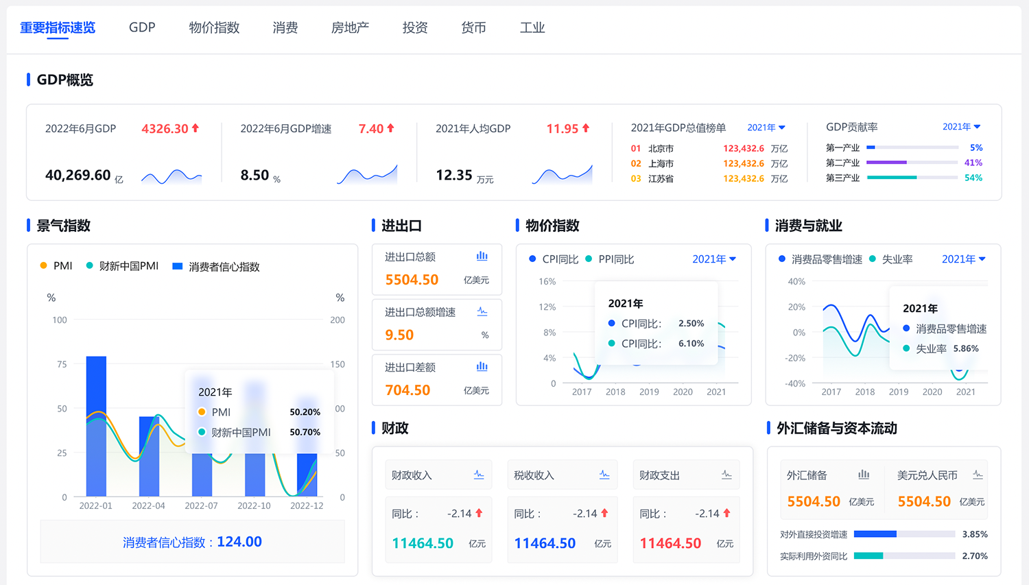 宏觀指標(biāo)拆解:通過(guò)六大方面宏觀指標(biāo)的分析拆解,運(yùn)用可視化手段直觀展示宏觀經(jīng)濟(jì)概況;