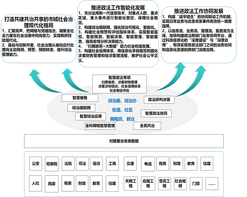 利用信息化手段更好的感知維穩(wěn)態(tài)勢、構(gòu)建防控體系、指揮協(xié)調(diào)作戰(zhàn),達到現(xiàn)有業(yè)務(wù)的統(tǒng)一展示、統(tǒng)一掌控、統(tǒng)一調(diào)度和統(tǒng)一指揮,實現(xiàn)社會突發(fā)事件的事前預(yù)防預(yù)控、事中高效處理、事后分析防控等機制,提升社會安全穩(wěn)定“預(yù)”能力,保障社會安全穩(wěn)定。
